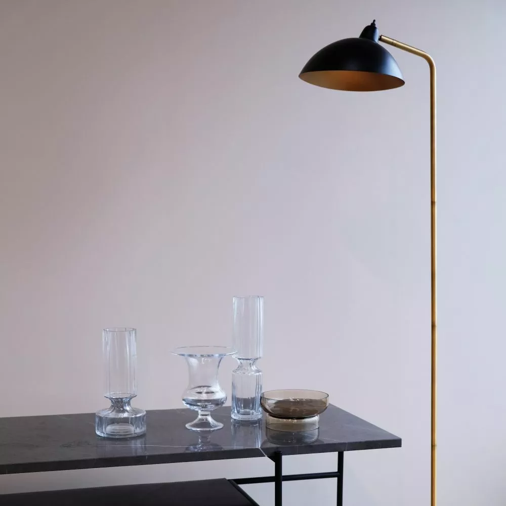 Lampens sorte overflade og antikke messing inde i lampeskærmen giver et varmt lys og skaber stemning i hjemmet.