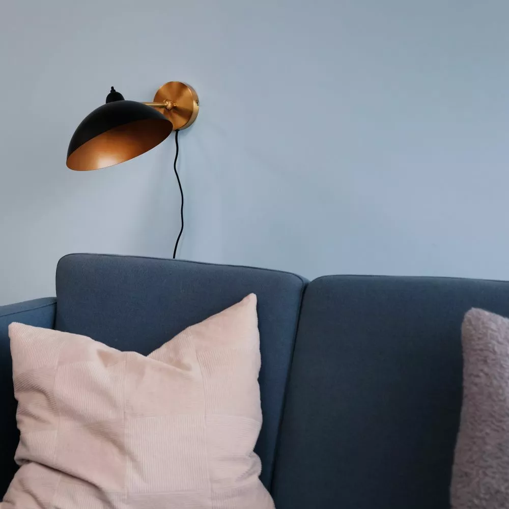 Lampen er lavet ud af metal og kontrasten mellem det sorte ydre og den antikke messing giver et varmt og dejligt lys.