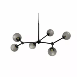 En lysekrone, hvor du kan justere de 6 arme og dermed præge lampen med dit helt eget udtryk. Kuplerne i smoke glas gør lampen eksklusiv i sit udtryk. De justeres nemt ved at dreje dem i den position man ønsker dem i.