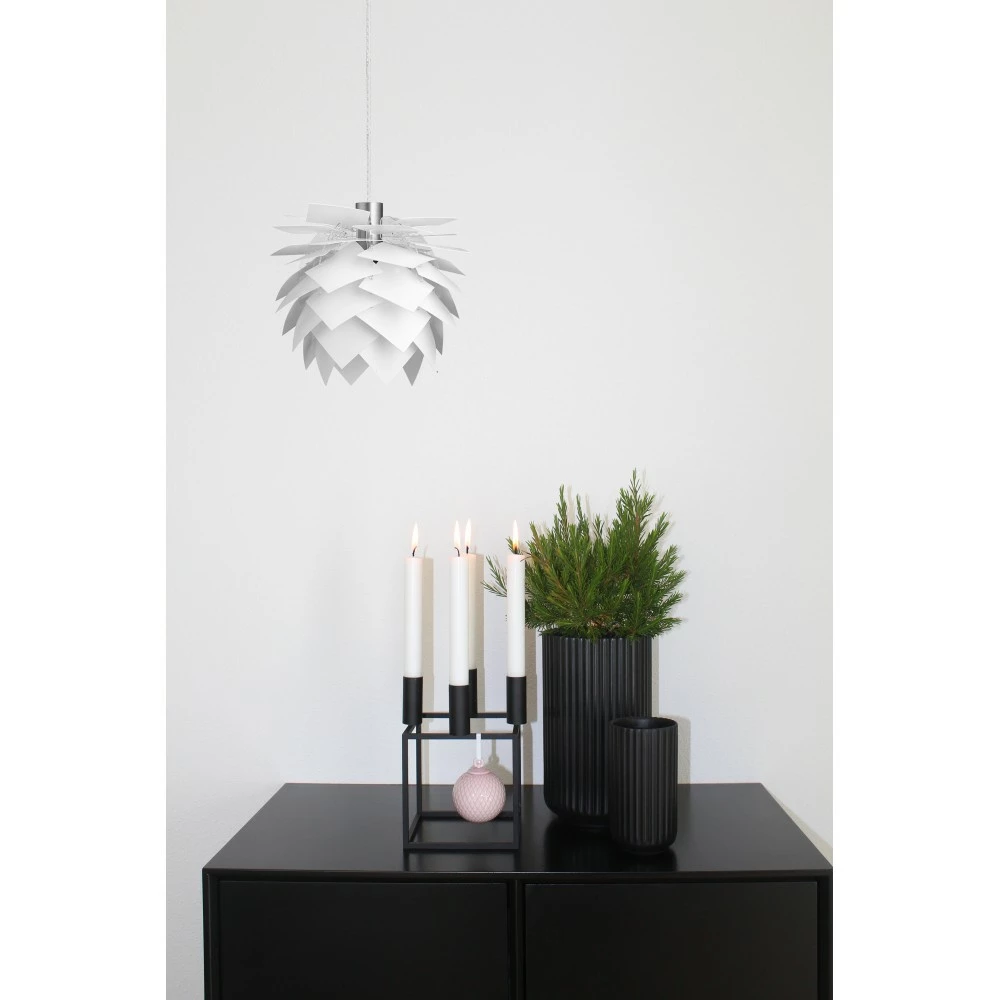 PineApple pendel XS LED G9 i 18 cm er en lampe der har et elegant udtryk, lampens størrelse gør sig rigtig godt i et vindue, på hylden eller over køkkenbordet med flere på række. Den hvide model er den mest klassiske farve. Den nye LED version gør det muligt at tilslutte direkte i kontakten. Leveres med aluminiumsrør i toppen til at dække fatningen.