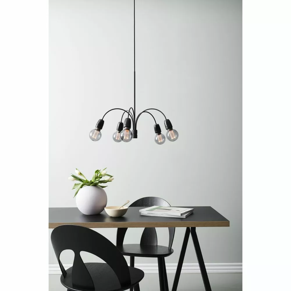 Denn elysekrone er med 5 styk E27 fatninger, der giver frit spil med hvilken lyskilde man ønkser, om det skal være lige fra spot til til standart eller en helt trejde med dekorativ belysning