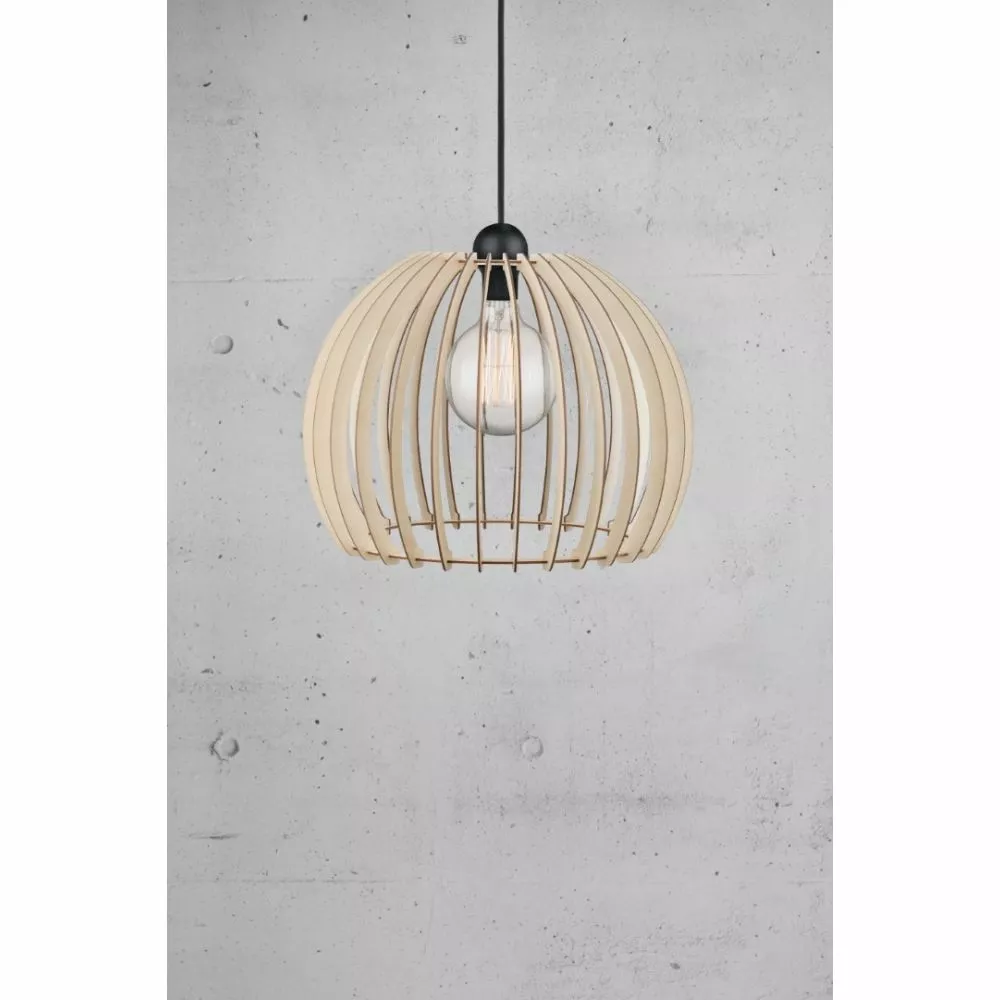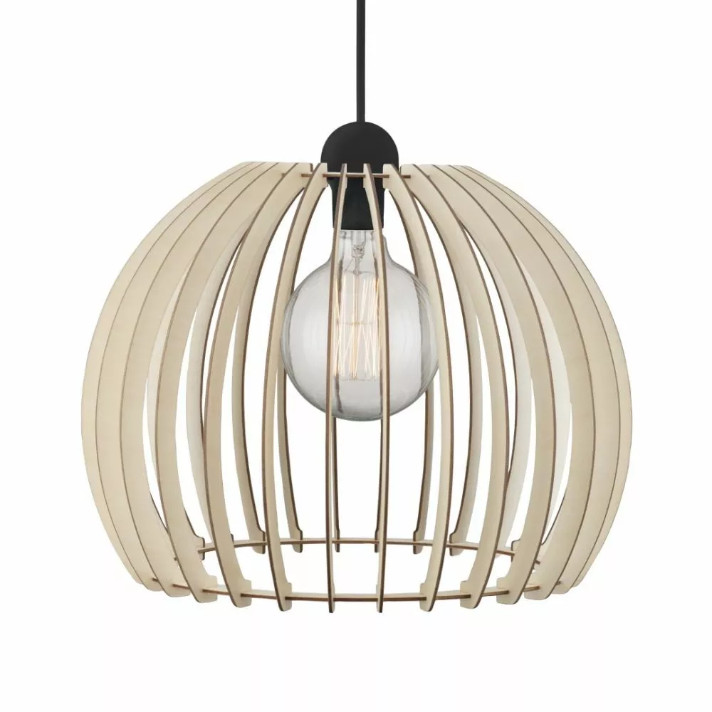 Pendellampe i et grafisk design med skærm af trælameller, som giver en behagelig lysspredning.