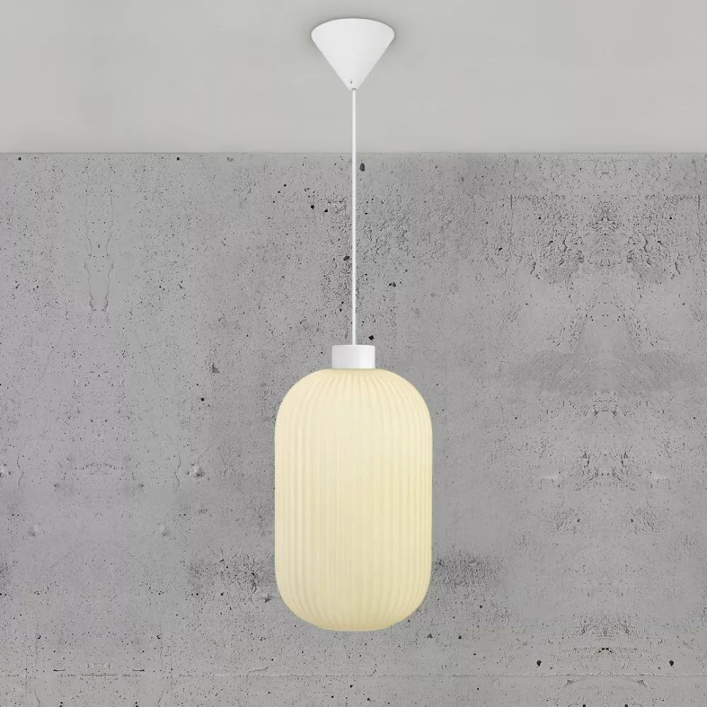 Dens lettere transparente, matte overflade lader et blødt og behageligt lys trænge igennem, hvor den rillede overflade giver pendlen sin helt egen, særlige udstråling.