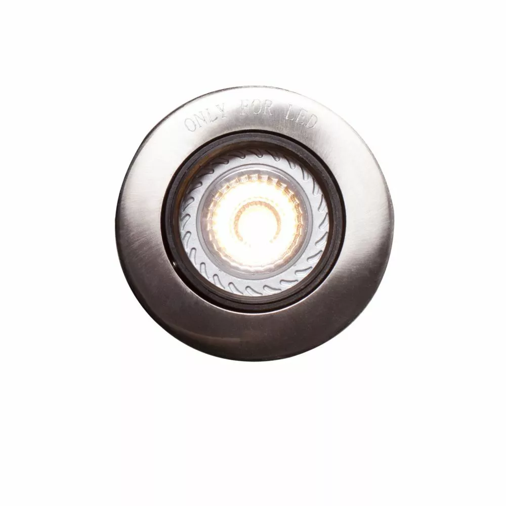 Enkelt indbygningspot med kip og udskiftelig yderring i børstet stål. Inkl. monteringsdåse, ekskl. lyskilder. Egnet til LED-lyskilder.