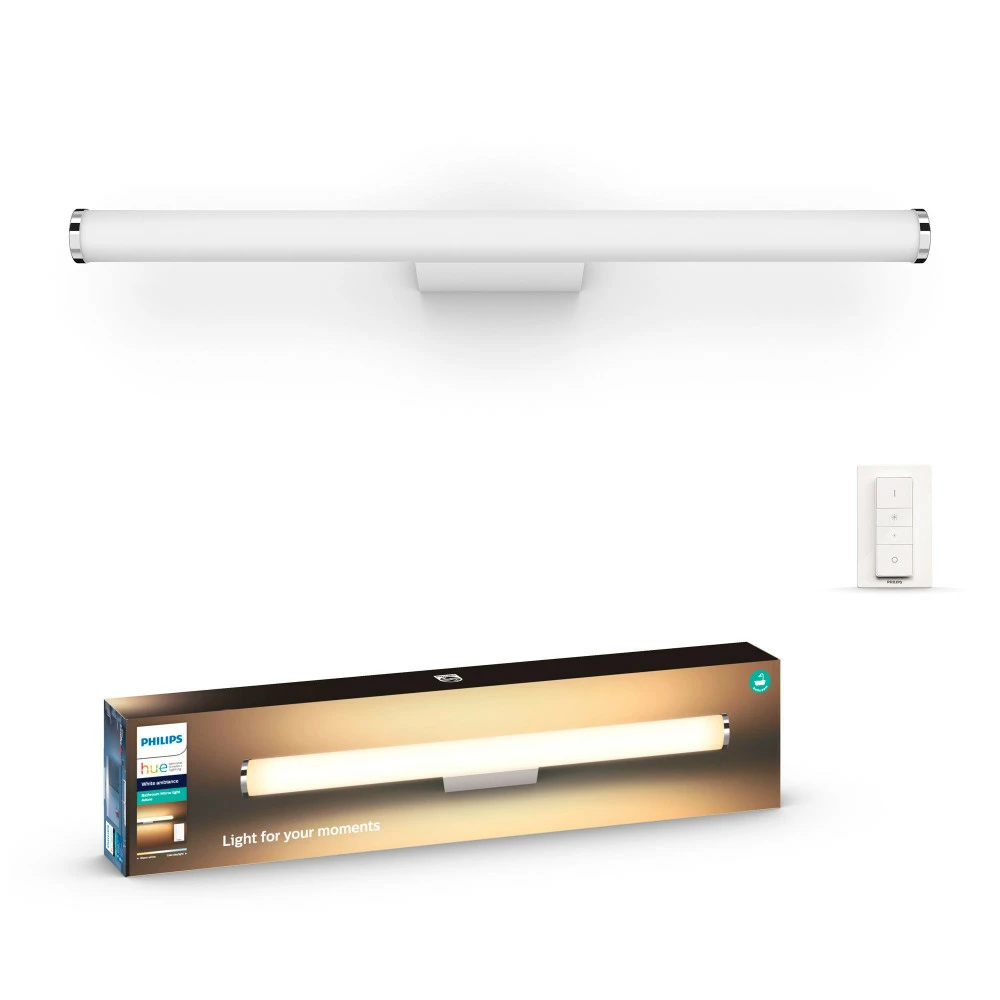 Det klassiske, slanke design på Philips Hue White ambiance Adore badeværelseslampe passer til indretningen i ethvert badeværelse. Styr lyset med en Hue Dimmer switch og skift i mellem de 4 lysscene: Energize, Concentrate, Read og Relax. Vælg den perfekte belysning til at lægge make-up eller gøre dig klar, til en særlig begivenhed. Placér lampen horisontalt over dit spejl, eller installer en vertikalt på hver side, for at opnå den ultimative stemningsbelysning.