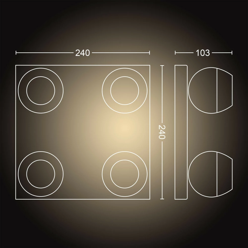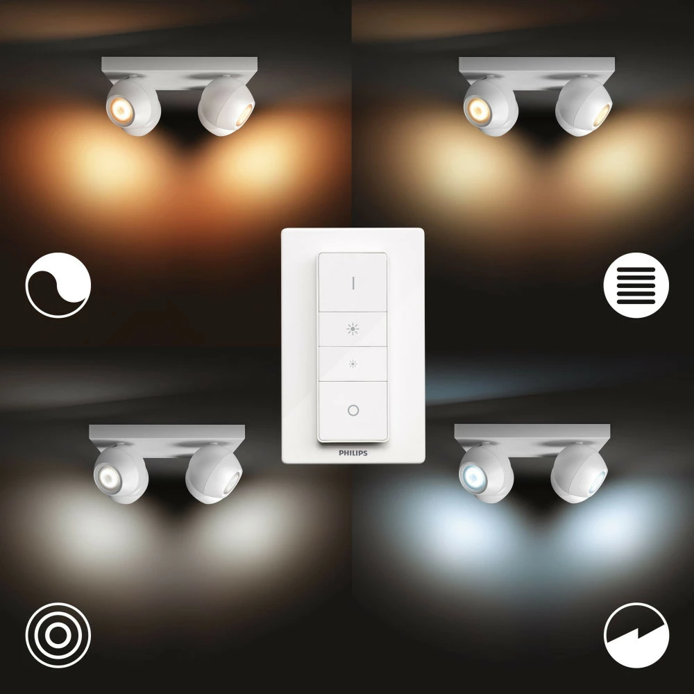 Med den hvide Philips Hue White ambiance Buckram får du fire spots til at oplyse rummet med. Hver spot kan justeres, så den fremhæver et hjørne af rummet, og med den medfølgende Hue Dimmer switch eller via Bluetooth får du øjeblikkelig kontrol over lyskilden. Opret forbindelse til en Hue Bridge, og få flere intelligente belysningsfunktioner.