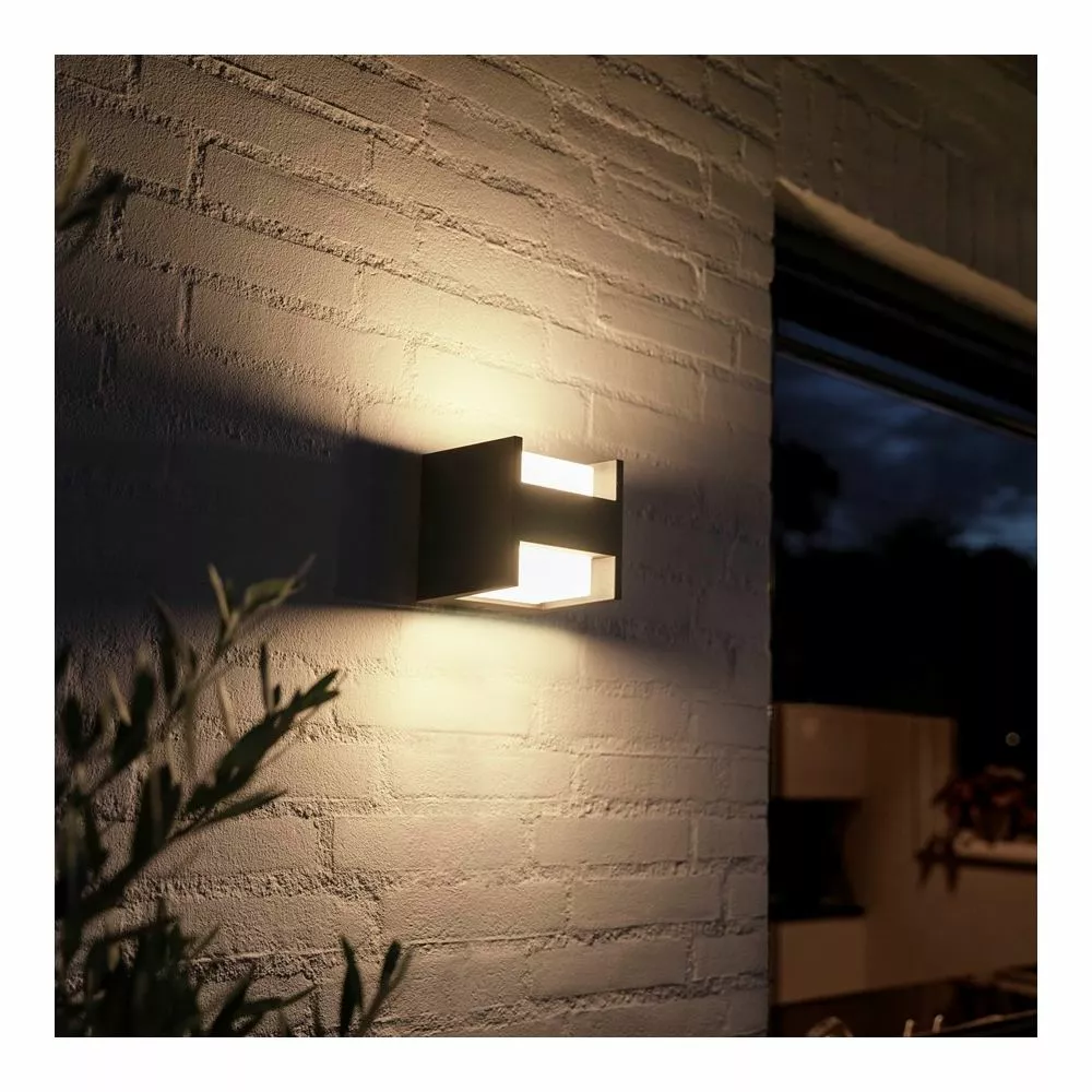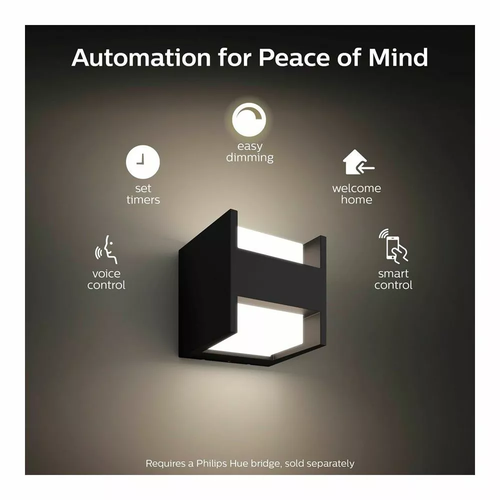 Philips Hue Fuzo er en familie af moderne firkantede udendørslamper. Som en del af White serien kan denne væglampe dæmpes i lysstyrke og lyse med forskellige hvide nuancer. Lyset kan fjernstyres, og du kan opsætte timere og indstille dine daglige rutiner, så du kan bydes velkommen hjem af en oplyst indkørsel, oplyse din have og terrasse, når mørket falder på, og have lyset tændt som en sikkerhedsforanstaltning, når du er væk hjemmefra. Lampen kræver en Hue Bridge (medfølger ikke) og en 220-240V fast installation.