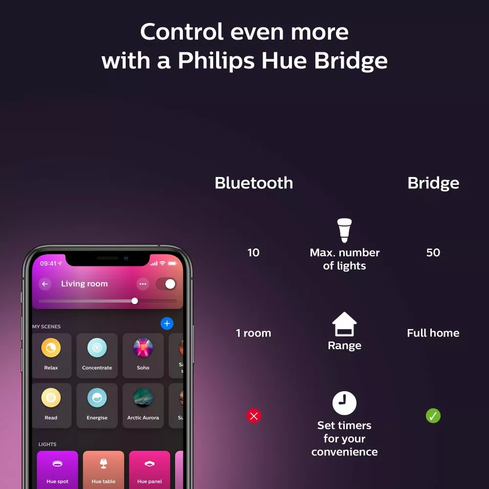 Med en Hue Bridge kan du tilføje op til 50 intelligente lyskilder og betjene dem overalt i dit hjem