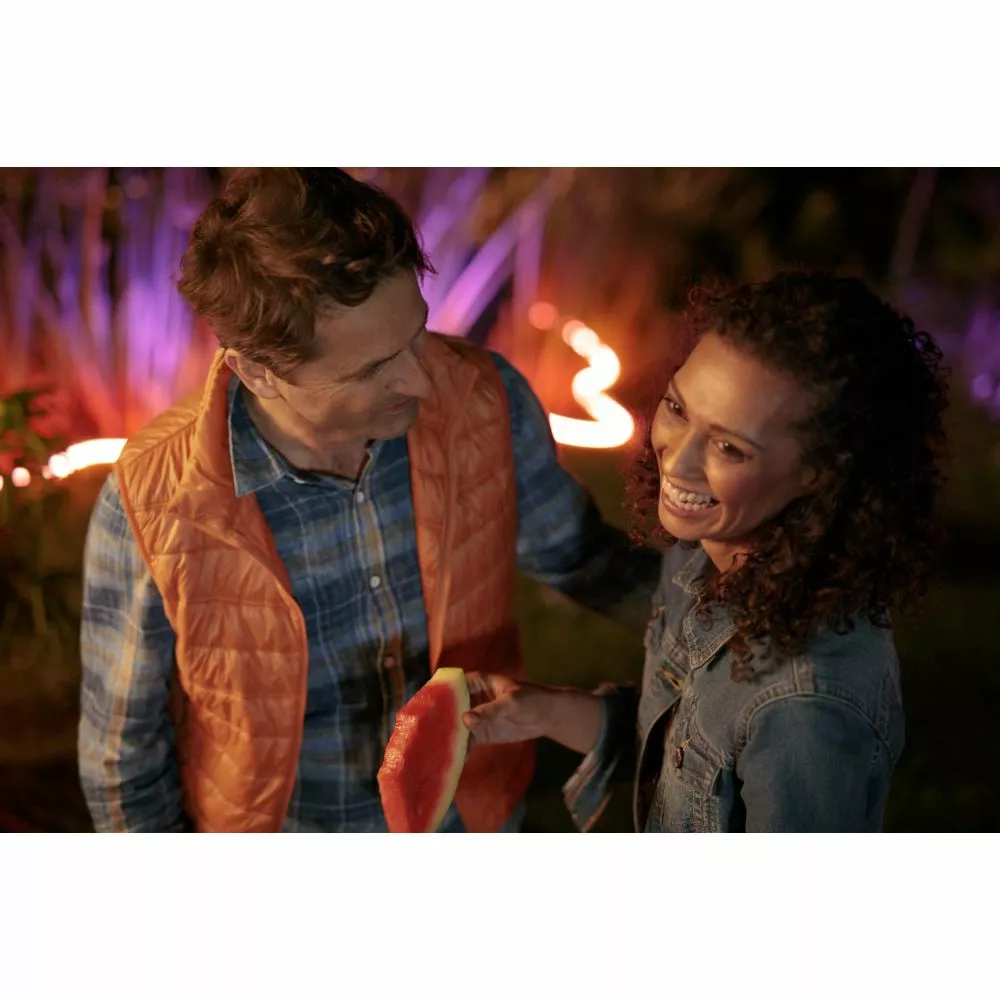 Med over 16 millioner farver og 50.000 nuancer af varmt og køligt hvidt lys kan du pynte op såvel udendørs som indendørs, uanset om du oplyser en gangbro eller sætter spotlight på den smukkeste eller hyggeligste del af terrassen.