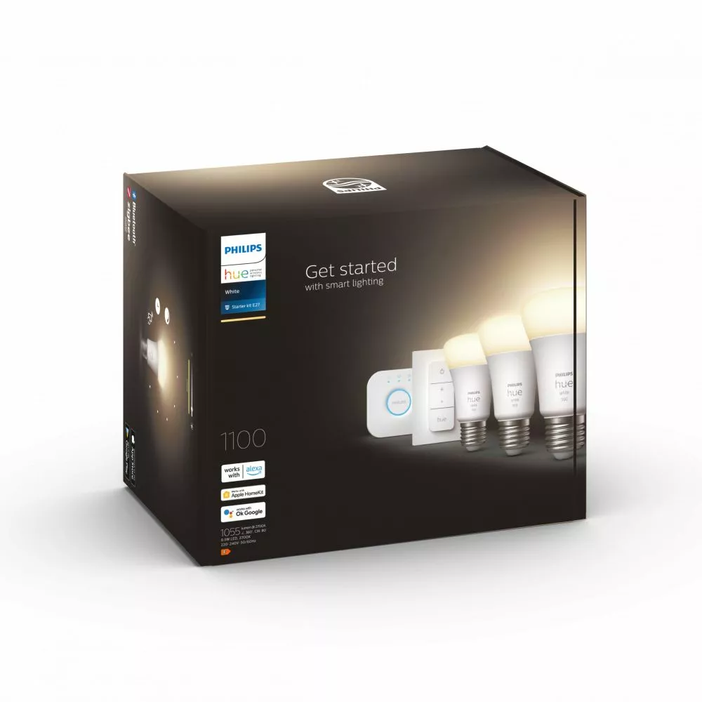 Dette startsæt indeholder tre Philips Hue White E27 pærer, en Hue Bridge, der er selve hjernen i Hue belysningssystemet, samt en Dimmer switch, der både fungerer som vægkontakt og trådløs fjernbetjening