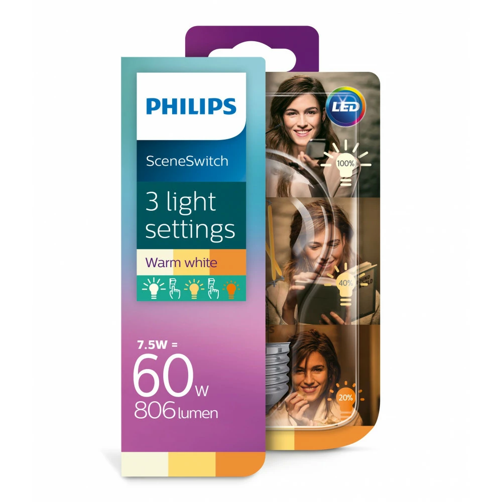 Philips LED 60W SceneSwitch standard filament, varm hvid, klar, 3 skift E27 1 stk – 8718696743096