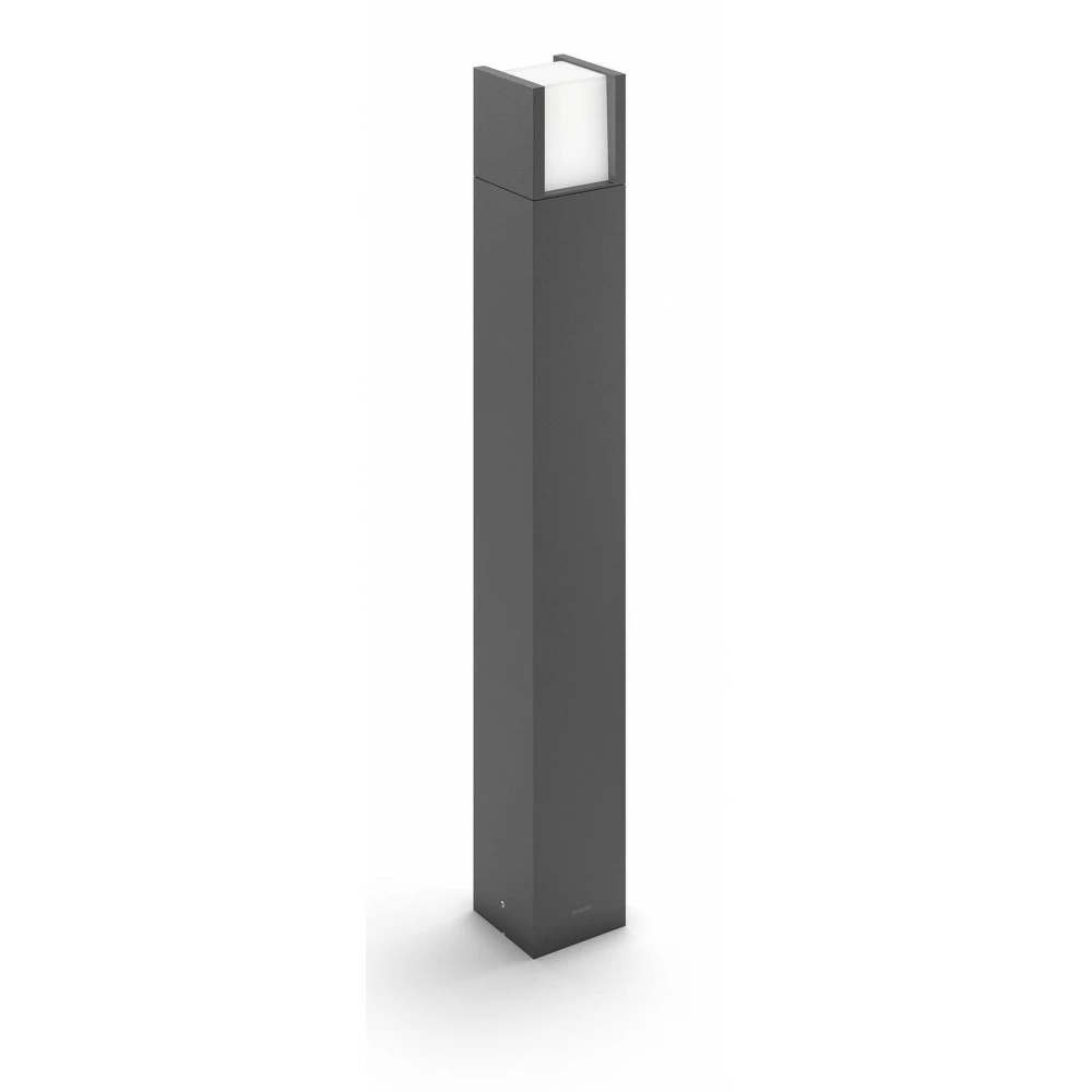I Philips Arbour LED udendørs søjlelampe i antracitgrå svæver en lyskube indeni en solid holder i holdbart støbt aluminium. Det geniale design sender to stråler af diffust, varmt, hvidt lys ud over gangstier og åbne udendørsområder.