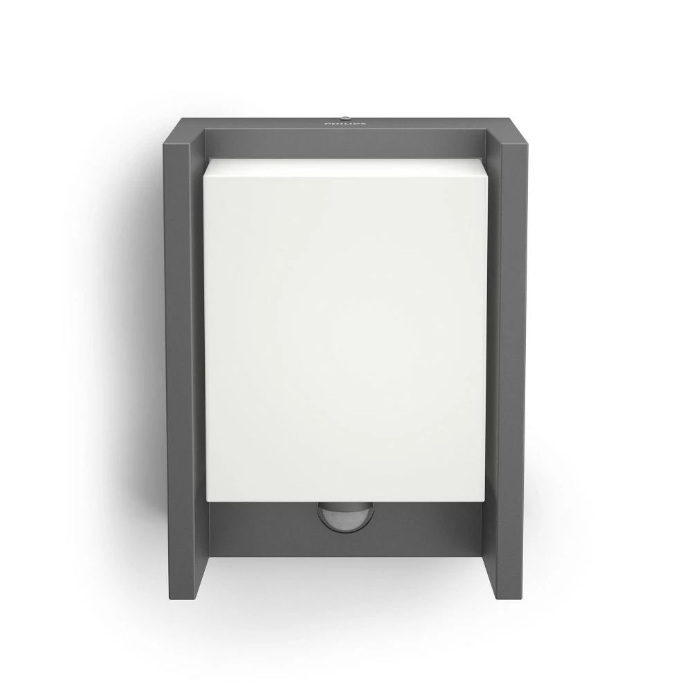 Philips Arbour LED udendørs væglampe i antracitgrå indrammer et lyspanel i en robust ramme i støbt aluminium, og den har en bevægelsessensor. Dette billede af lys oplyser dit udendørsområde med diffust, varmt, hvidt lys.