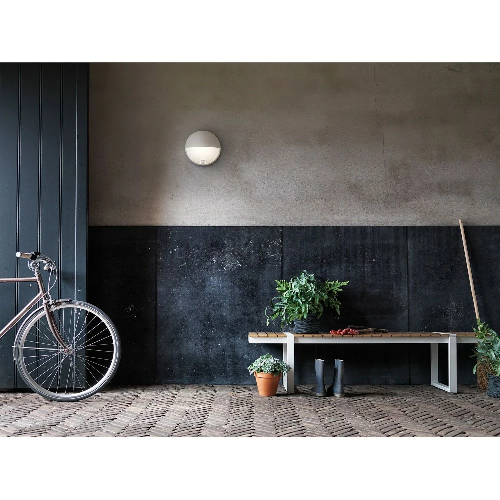 Denne runde kuppelformede Philips Capricorn LED udendørs væglampe i lysegrå er fremstillet i holdbart støbt aluminium, og den har en bevægelsessensor af hensyn til sikkerheden. Halvmånedesignet oplyser udendørsområder med et kraftigt, men diffust, varmt, hvidt lys.