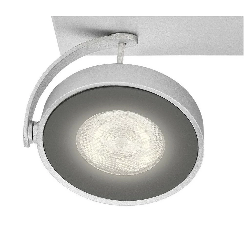 Denne Philips Clockwork firedobbelte spotlampe i aluminium har en ren geometrisk form. Hver af de store, justerbare hoveder har LED-lyskilder omgivet af en gråtonet ring. Den har et ClickFIX-system, der er nemt at montere, og virker med alle former for lysdæmpere.