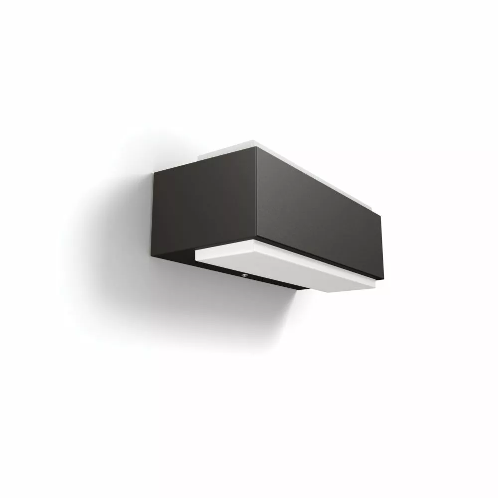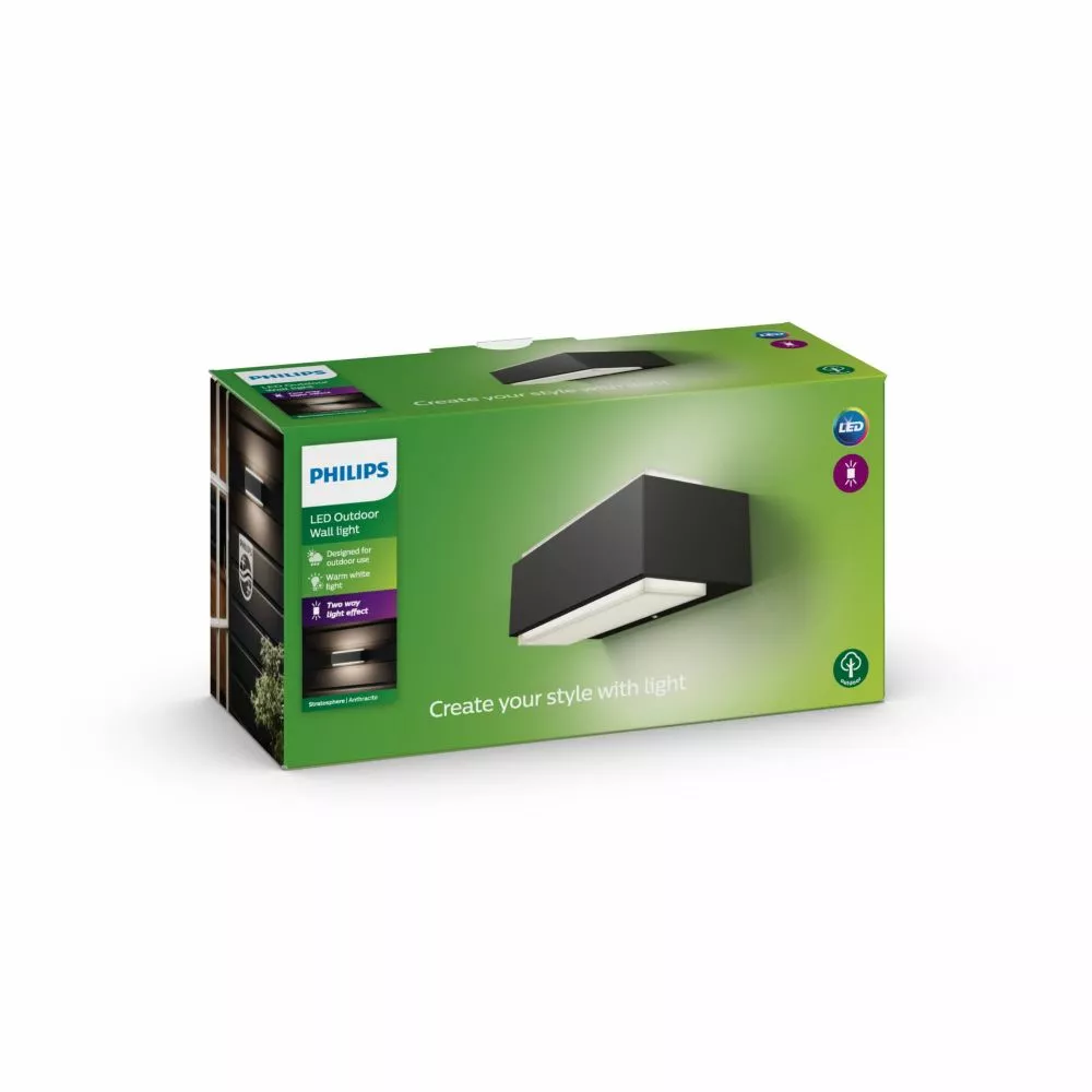 Philips Stratosphere udendørs LED vægbelysning i antracitgrå er fremstillet i holdbart støbt aluminium. Designet spreder lyset i to retninger og oplyser din væg med masser af virkningsfuldt, varmt, hvidt lys.